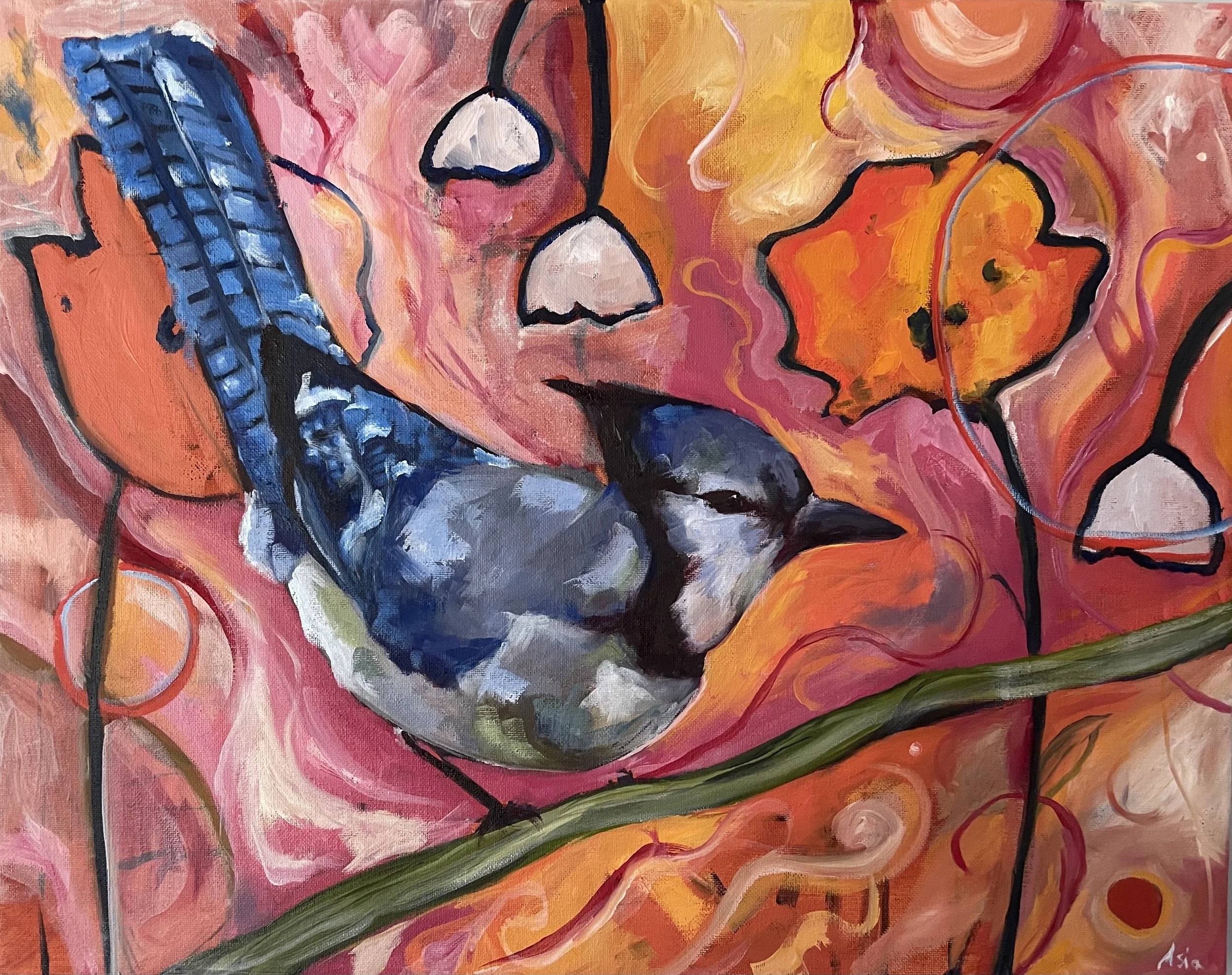 Bluebird in Swirl, Oil on Canvas, 2024. 16”x 24”